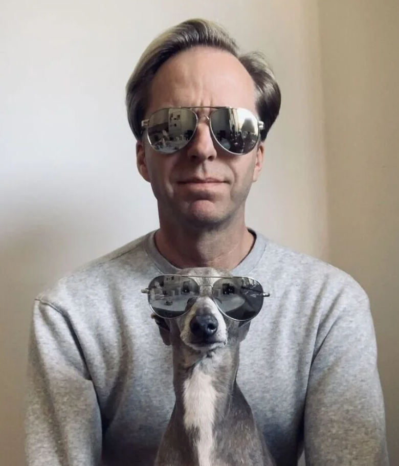 - На одной из фотографий можно увидеть собачку и ее хозяина, оба с серьезным выражением лиц и стильными солнечными очками. Обратите внимание на гармонию в цветах: серый наряд владельца идеально дополняет окрас шерсти питомца.