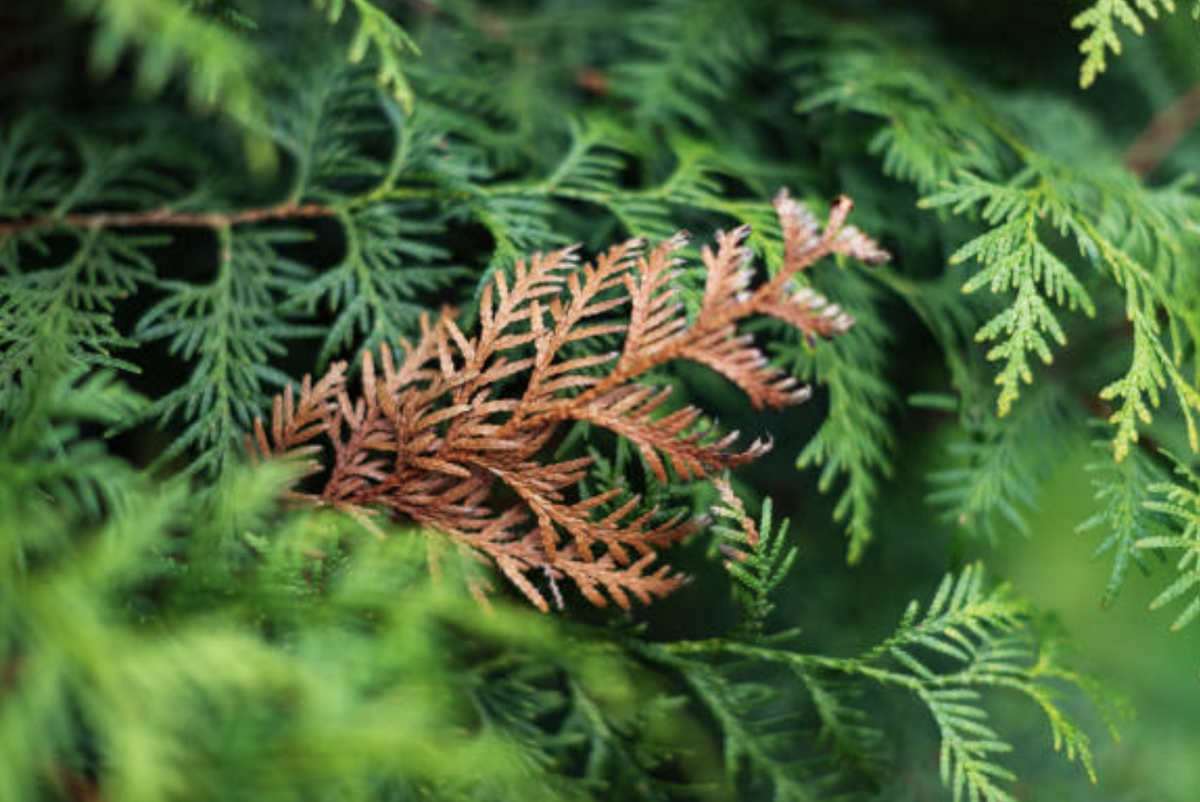 Первым шагом в восстановлении туй становится удаление всех засохших и поврежденных элементов листвы. Используйте мягкие грабли или защитные перчатки, чтобы бережно расчистить растения. Следует помнить: важно очищать не только внешние ветки, но и внутреннюю часть кроны! Удалите все пожелтевшие части, чтобы свести к минимуму риск болезней и повреждений.