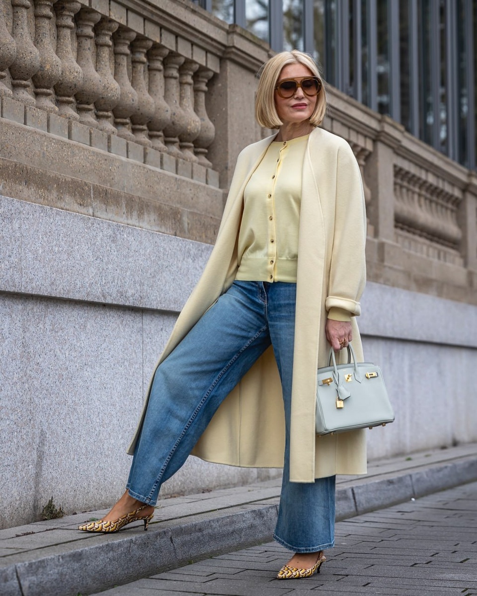 - Джинсы и элегантность. Светло-синие зауженные джинсы в сочетании с бледно-желтым кардиганом на пуговицах создают гармоничный образ. Добавьте пальто сливочного оттенка и стильные слингбэки с коричневым принтом для завершения лука.