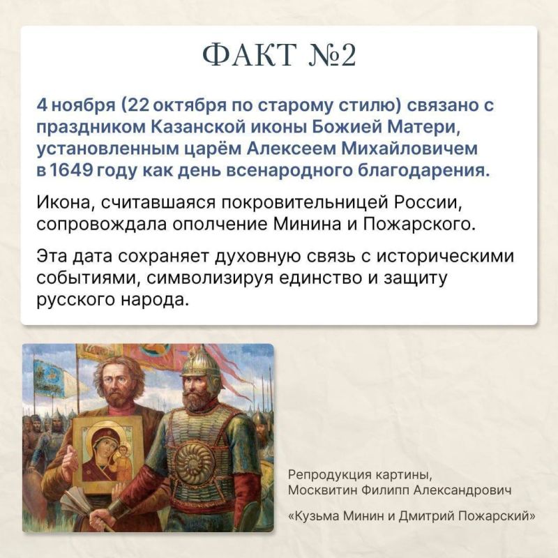 «Это один из самых знаковых государственных праздников нашей страны. Он напоминает нам о событиях, сыгравших важнейшую роль в истории нашего Отечества. Тогда, в 1612 году, народное ополчение под предводительством Минина и Пожарского освободило Москву от иноземных захватчиков, отстояло свободу и независимость. И так было во все переломные моменты истории – наш народ объединялся ради общей великой цели, ради победы.