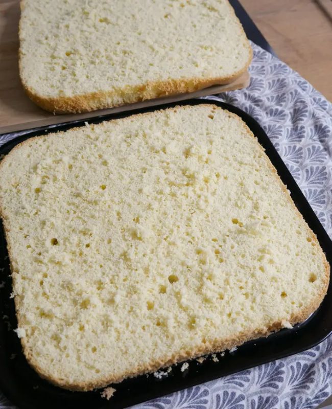 Готовое тесто следует переложить в форму для выпекания размером 24x24 см, заранее устланную бумагой для выпечки. Выпекать бисквит нужно при температуре 180 °C около 20 минут или до тех пор, пока зубочистка не выйдет чистой.