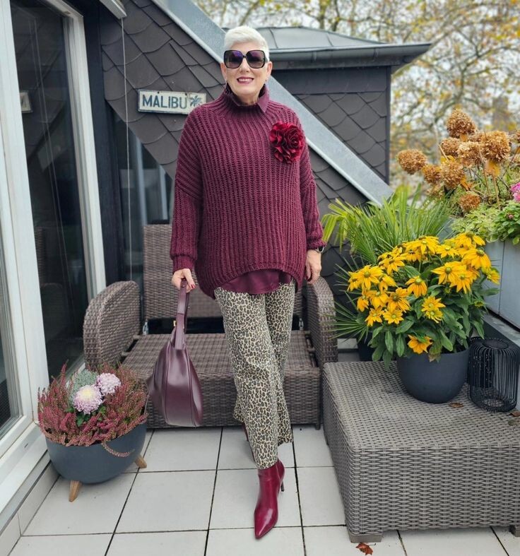 - Легкость и комфорт: Свободные брюки с леопардовым принтом подойдут любой фигуре. В сочетании с бордовой рубашкой оверсайз и объемным свитером в той же палитре, такой наряд будет выглядеть стильно. Яркие полусапожки дополнят образ, а сливовая сумка добавит яркости.