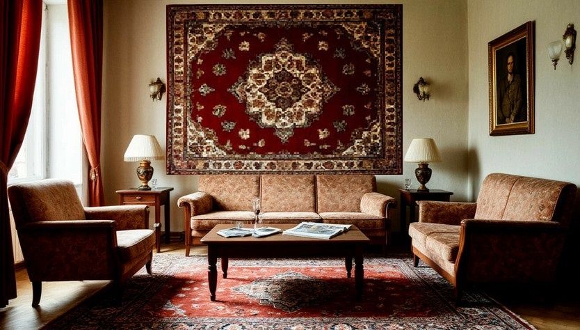 Ковер на стене можно рассматривать как универсальный предмет, который мог служить не только декором, но и спальным местом для гостей, дополнительной теплотой в холодные ночи или даже способом скрыть недостатки стен. Массовая застройка часто страдала от неидеального ремонта: неровные стены и трещины были обычным делом. Ковер отвлекал внимание от таких недочетов и одновременно обеспечивал уют.