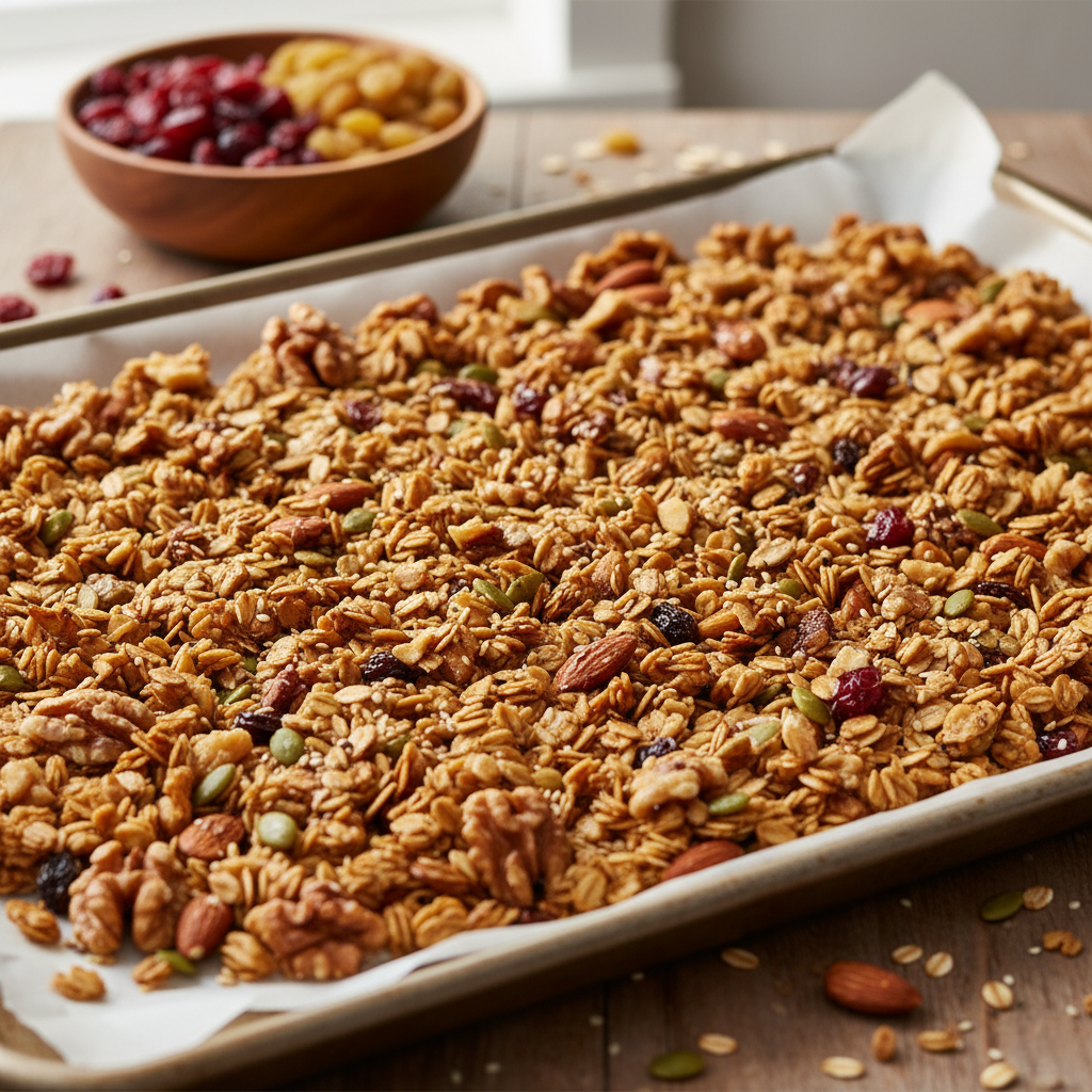 - Запекание: Выложите смесь на противень ровным слоем и отправьте в духовку. Запекайте 25–40 минут, периодически помешивая для равномерного подрумянивания. В конце выпекания можно оставить гранолу в покое, если цель — добиться освоения крупных "комочков".