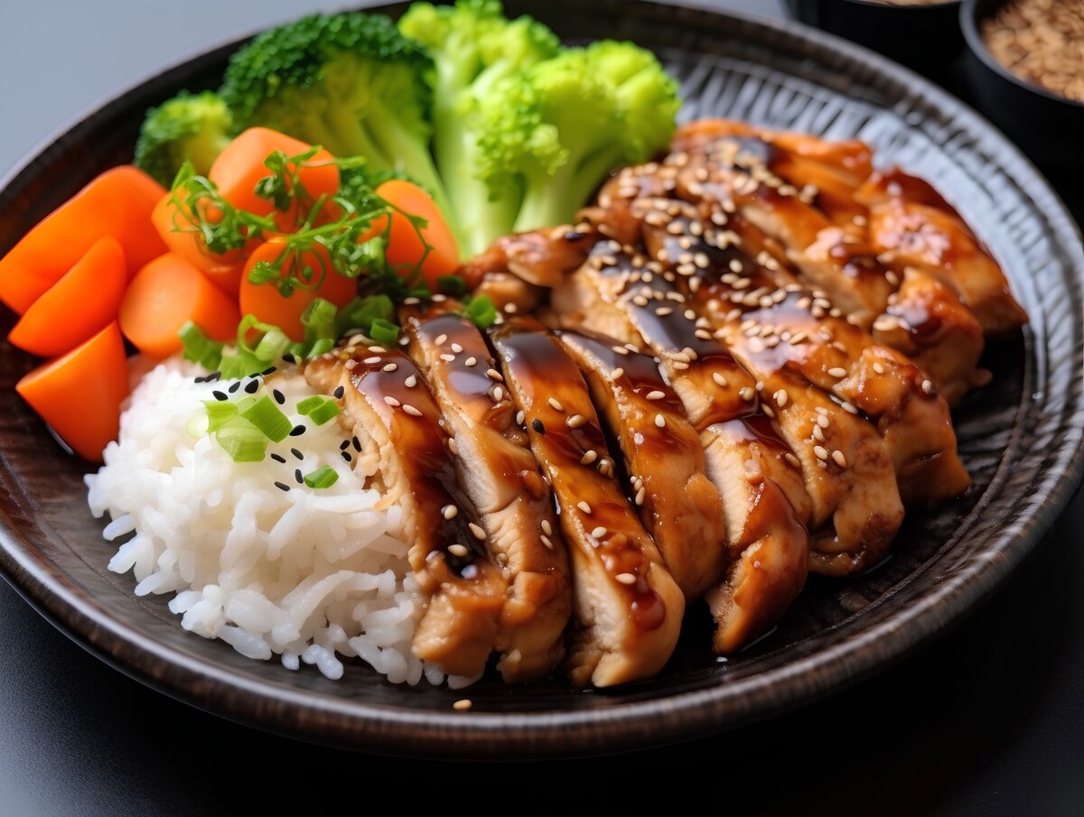 Курица терияки с овощами готова к подаче! Это ароматное блюдо отлично сочетается с отварным рисом, создавая идеальный ужин для семьи или друзья.