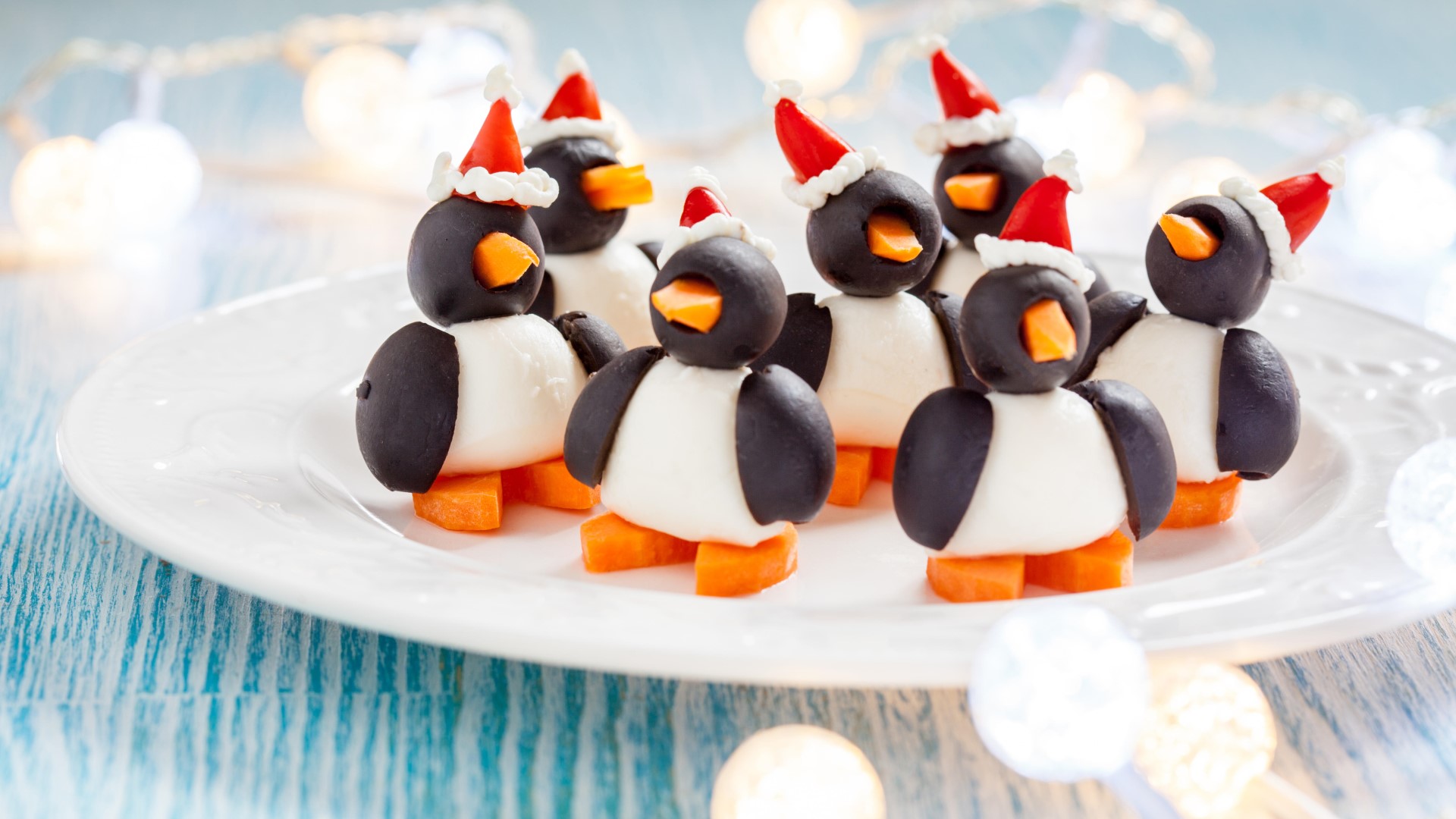 Вставьте в отверстие маслин треугольники из морковки, по краям моцареллы прикрепите черные половинки. Посадите на творожный крем колпачки из перца и поместите на головы фигурок. Сделайте из сыра помпоны, советует Telegram-канал «Время есть». Готово!