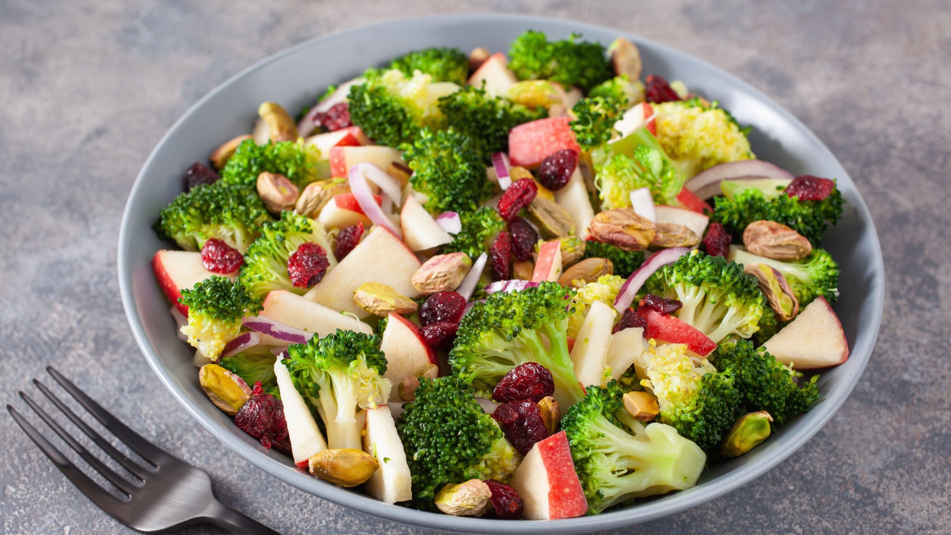 Разогрейте масло в сковороде и обжарьте в нем бекон, порубленный кубиками. Нарежьте брокколи и лук на небольшие кусочки, смешайте с поджаренным беконом. Туда же отправьте орехи и изюм.