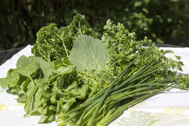 Шпинат и щавель необходимо помыть и отварить в разных кастрюлях, держа на огне около минуты после закипания. Зелень следует мелко нарезать, протереть через сито, после чего смешать с квасом.