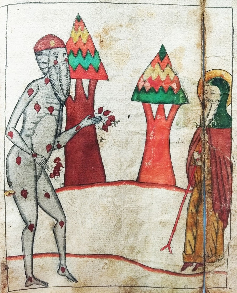 Дьявол, увешанный небольшими тыковками, направлялся в ближайший монастырь. Эти яркие плоды, на первый взгляд, могли показаться символом праздника, однако в руке у демона они скрывали настоящее зло. Когда святой спросил его о предназначении этих тыковок, демон не стал скрывать свои намерения – он собирался искушать монахов, отвлекать их от праведной жизни с их помощью.