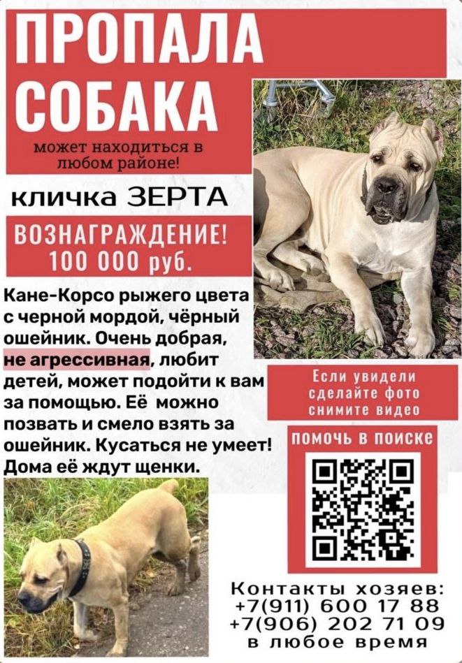 Если вы видели или знаете, где находится собака Зерта, не оставайтесь равнодушными и позвоните пожалуйста по телефону 8 911 600 17 88 или 8 906 202 71 09.