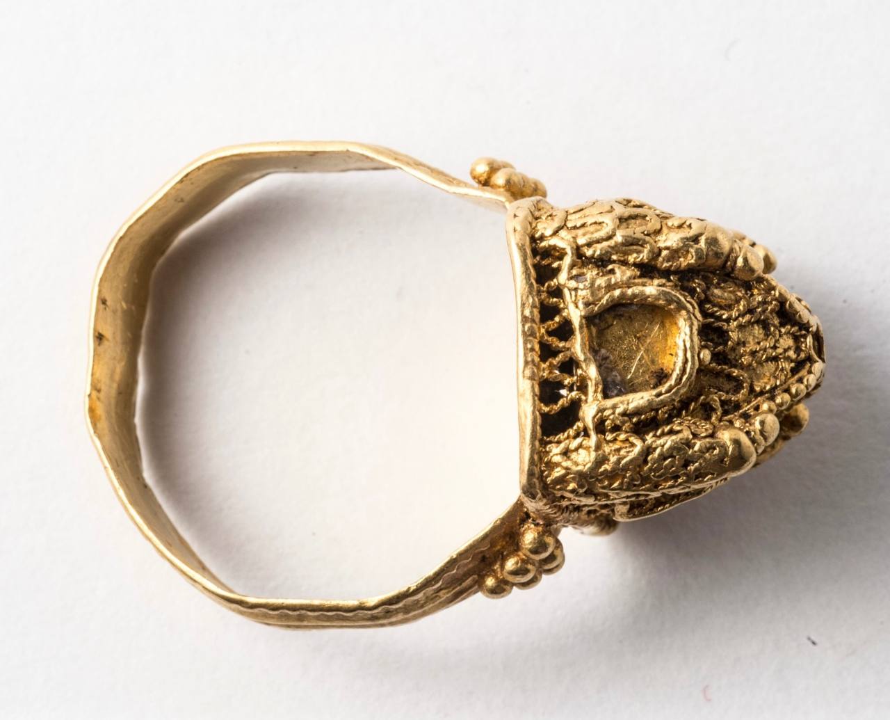 Артефакт обнаружили в 1999 году на Троицком-XII раскопе, на усадьбе семьи с высоким социальным статусом. Его форма напоминает традиционные еврейские свадебные кольца в виде миниатюрного домика – символ семейного очага и благополучия. Исследователи предполагают, что украшение могло попасть в Новгород как дорогой заморский сувенир или подарок.