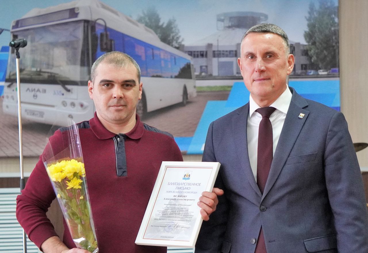 Поблагодарил работников ГК «Круглый гараж» за их нелегкий труд, профессионализм и любовь к выбранной профессии, а также вручил благодарственные письма и грамоты за вклад в развитие транспортной отрасли нашего Великого Новгорода.