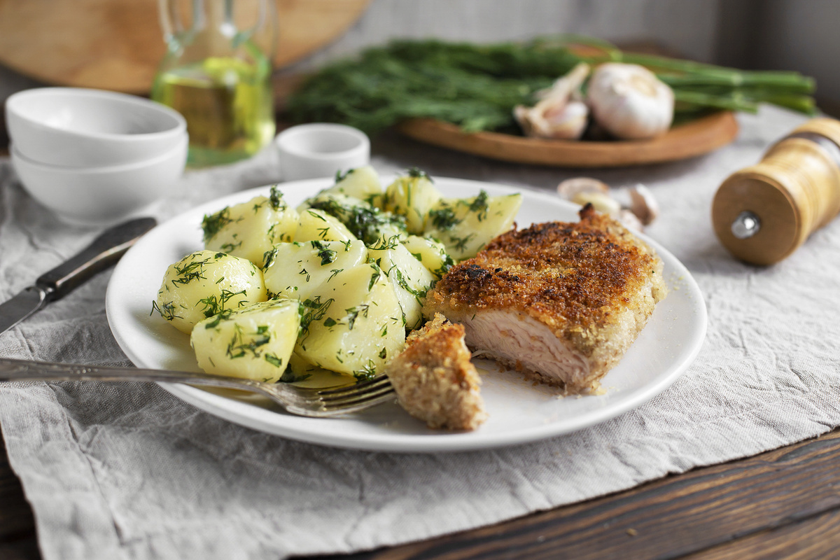 Шаг 3: Каждый кусочек филе сначала обмакните в яйцо, затем тщательно обваляйте в сухарях. Обжаривайте индейку на среднем огне по 7-9 минут с обеих сторон до золотистой корочки. Удобно подавать индейку с отварным картофелем, приготовленным ранее. Блюдо стоит подавать горячим, чтобы насладиться всеми его ароматами и вкусом.