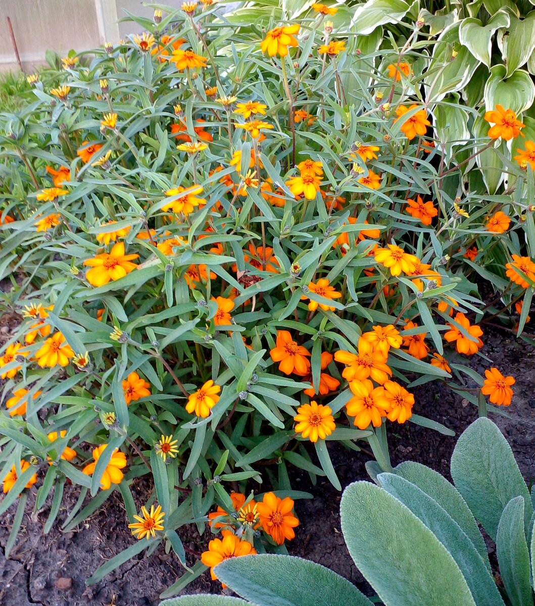 С момента высадки в клумбу цинния 'Оранжевая звезда' быстро разрастается и радует глаз обильным цветением. Каждое соцветие диаметром около 4 см кажется настоящей звездочкой на фоне зеленых листьев. Эти милые цветы великолепно смотрятся, образуя плотный коврик, который привлекает внимание прохожих и создает атмосферу праздника в саду.