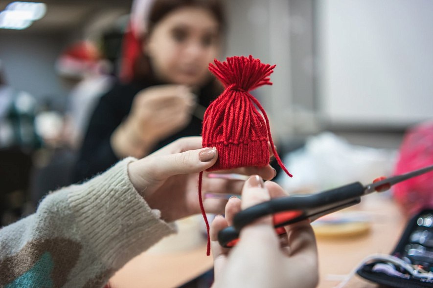 Члены совета Института непрерывного педагогического образования провели новогодний мастер-класс по изготовлению ручных игрушек для благотворительной акции. Группа студенток сама закупила дерево, ткань и пряжу для творчества.