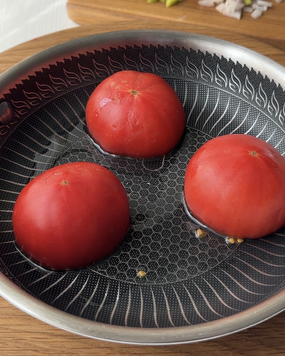 Помидоры нужно выкладывать срезом вниз на сковороду, давая им немного подрумяниться. В центр добавьте нарезанный лук, перец и чеснок, создавая «гнёздышко» из овощей. Накройте сковороду крышкой и оставьте на 5 минут, чтобы овощи стали мягкими и пропитались ароматами.