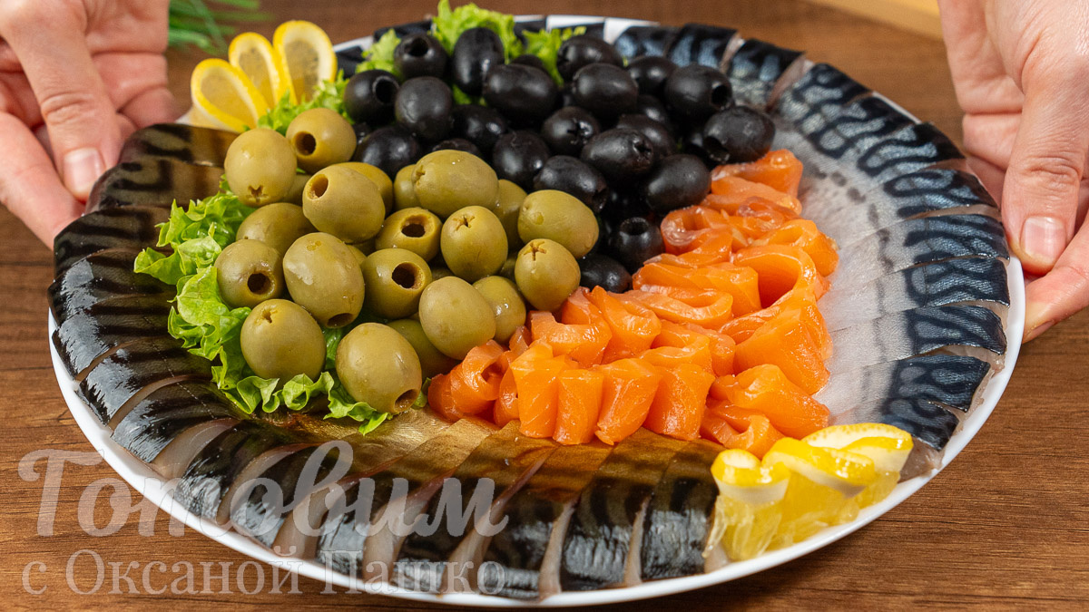 Первая рыбная тарелка удовлетворит любителей классики. В ней сочетаются нотки копченой скумбрии, соленой сельди и изысканных оливок, что делает её идеальным вариантом для дружеской встречи или семейного праздника.