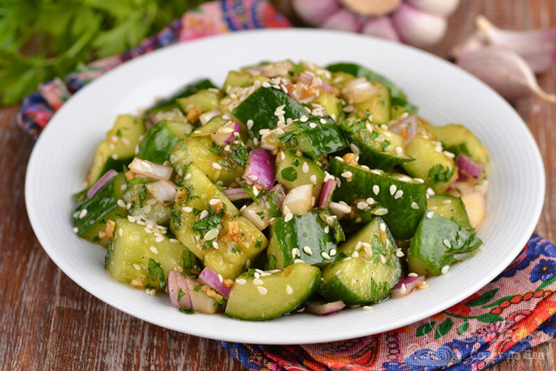 Теперь огурец делят вдоль на две части, а затем нарезают поперек на среднего размера кусочки. Они отправляются в миску вместе с мелко нарезанным луком и петрушкой. Все ингредиенты щедро поливаются предварительно приготовленной заправкой и тщательно перемешиваются. Рекомендуется попробовать на соль и при необходимости подкорректировать вкус.