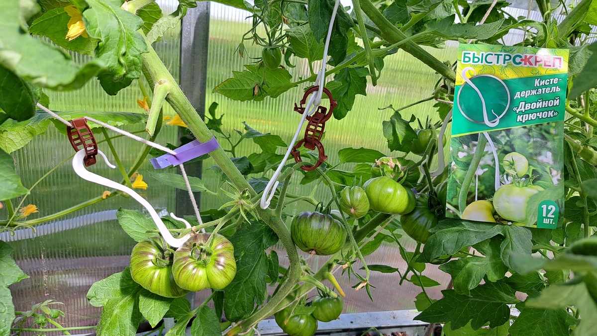 Двойной крючок стал одним из самых впечатляющих элементов набора. Его длина составляет около 12 см, что позволяет легко зацепить кисть томатов за опору или шпагат. Для согласованности использования с вертикальными шпагатами рекомендуется дополнительно применять клипсы, обеспечивающие надежное крепление. Для избежания изломов в наиболее нагруженных местах, кисть можно зафиксировать с помощью держателя "Улитка".