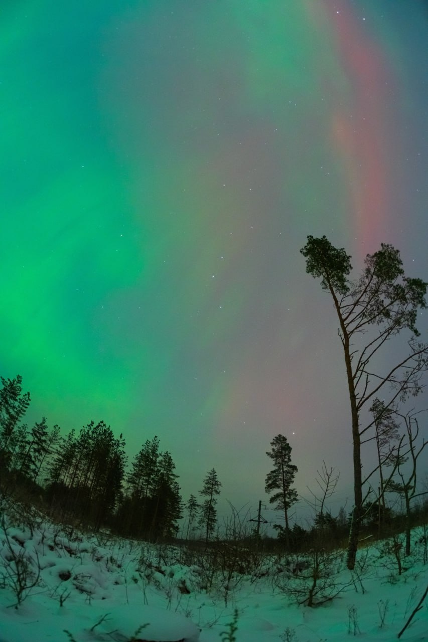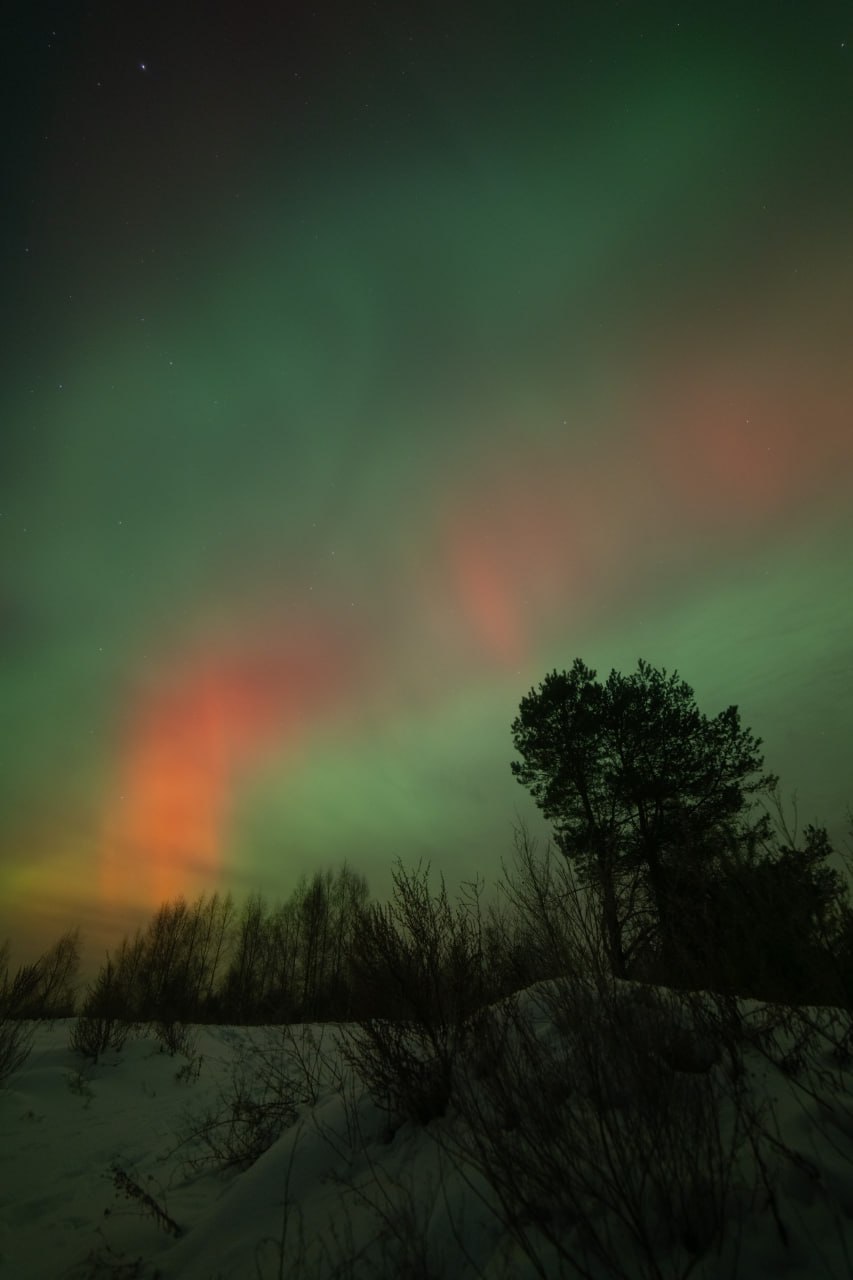 Им посчастливилось запечатлеть начало самой активной и яркой фазы, после чего облака закрыли небо. Попытка найти новую точку для съёмки была лишь частично успешной — следующему просвету помешала дымка, а пик красоты сияния к тому времени уже прошёл.