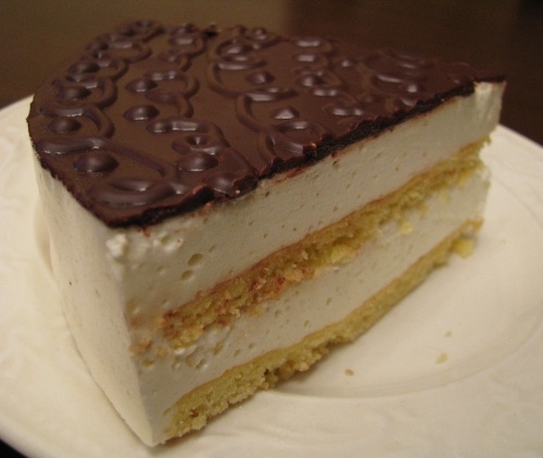 Теперь в белковую массу аккуратно вводите масляный крем, а затем залейте в подготовленную форму с коржами. Уберите в холодильник для застывания (30 минут достаточно). Приготовьте глазурь и залейте находящийся в холодильнике торт, оставьте до застывания глазури.