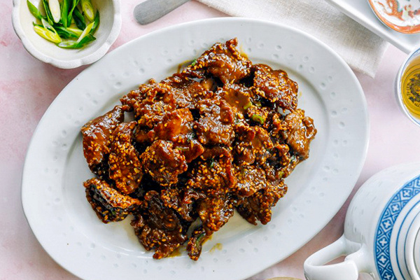 Кунжутная говядина считается ярким представителем китайско-американской кулинарии, но ее истоки уходят в кантонскую традицию жарки мяса с глазированием. В этом блюде вам не понадобятся огромные порции овощей — акцент идет на говядину, гармонично дополняющуюся простым рисом.