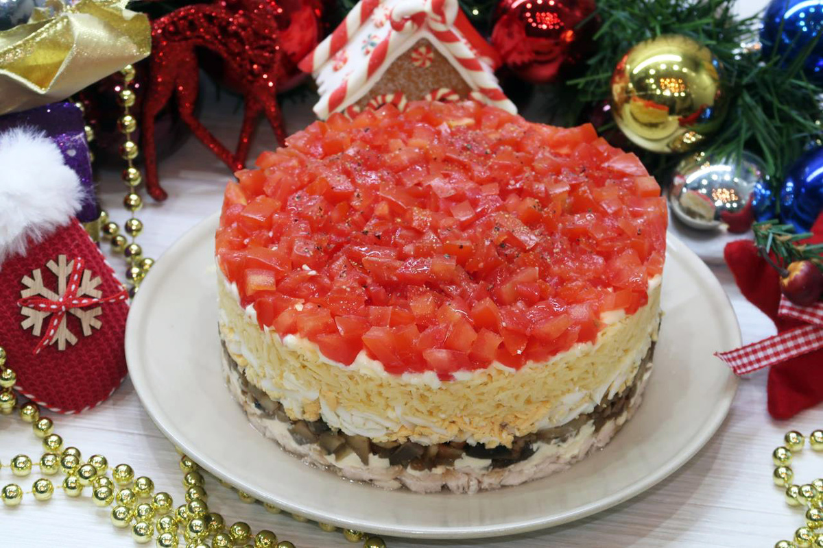 Приготовление блюда не займет много времени, а подать его можно как в большом салатнике, так и в форме для выпечки. Такой салат станет настоящей изюминкой на новогоднем столе, и гости непременно оценят его по достоинству.