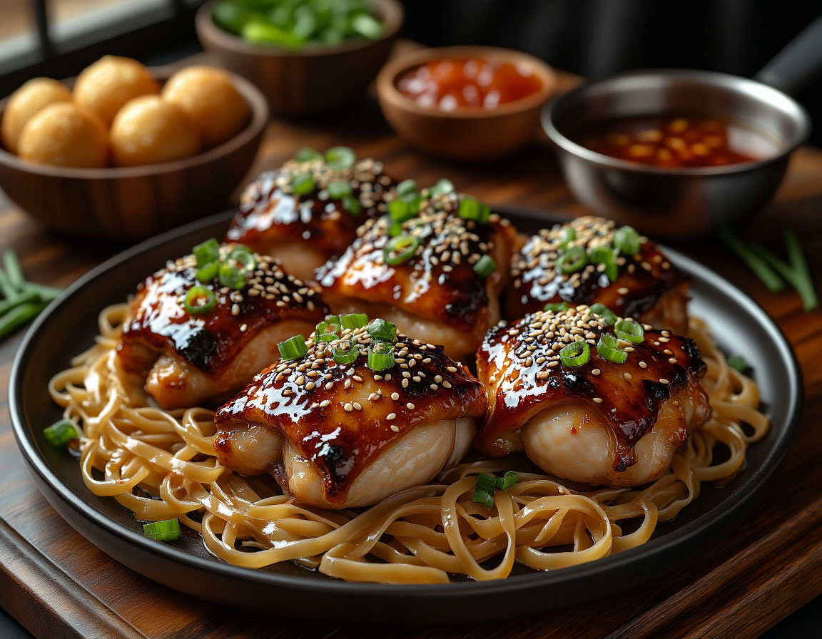 Духовка разогревается до 180 градусов. Курицу размещают на решетке над противнем, чтобы жир стекал вниз и мясо пропекалось равномерно. Прогретая глазурь образуется во время запекания, а каждые 10 минут поливают соками, чтобы сохранить сочность. За пять минут до конца включают гриль, чтобы образовалась карамельная корочка. Подача идёт на рисовой лапше с кунжутом и зелёным луком. Вкус сочетает остроту сычуаньского перца и сладость сиропа, а имбирь добавляет глубину.
