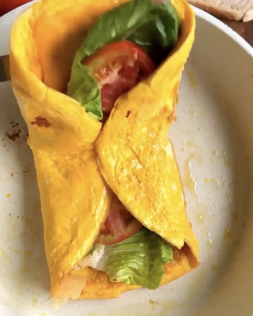 Вторая минутка — яйца: взбиваем их, заливаем на освободившееся место в сковороде и ждём, пока смесь схватится. Вкус дополняют свежая зелень и ломтики помидора, которые добавляют свежесть и цвет. Всё готово за считанные минуты, без лишних движений и хлопот.