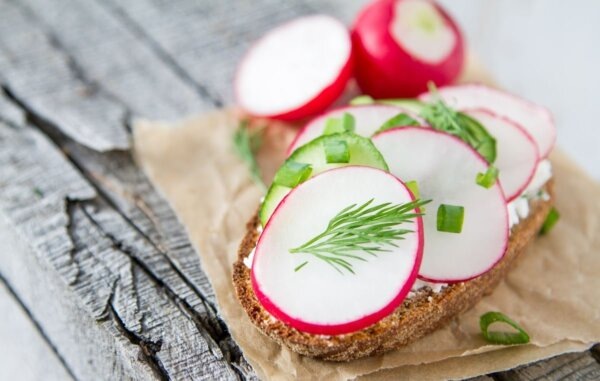 Хлеб разрезаем пополам. На одну половину наносим масло, кладем огуречные кружки и редису, слегка посыпаем зелёным луком. Накрываем второй половиной хлеба, скрепляем ветчиной и украшаем луковыми перьями. Получаются десять аппетитных бутербродов, которые украсит любая закусочная полка дома или на работе.