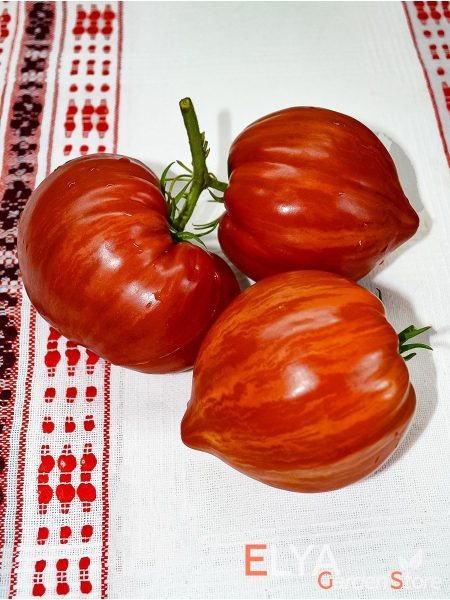 Основная отличительная черта — форма сердцевидная и крапчатый рисунок в верхней части плода. В фазе созревания фон становится оранжево-красным, а на плечиках появляются золотистые полоски, которые делают каждый плод уникальным. Маслянисто-сладкая мякоть сохраняет вкус после тепловой обработки.