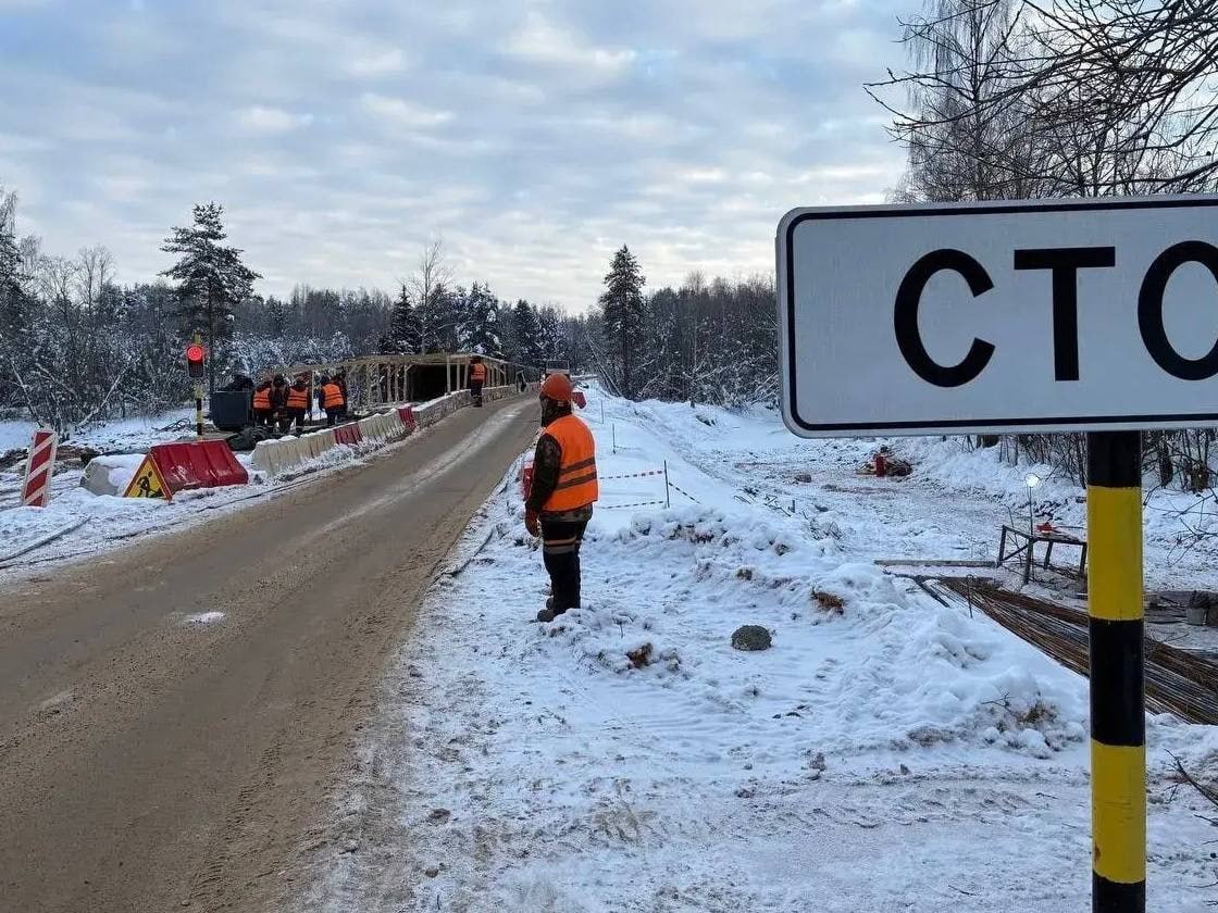 Вблизи деревни Перетенка-2 на дороге Окуловка Кулотино Топорок по нацпроекту Инфраструктура для жизни ведется ремонт железобетонного моста через реку Перетна.