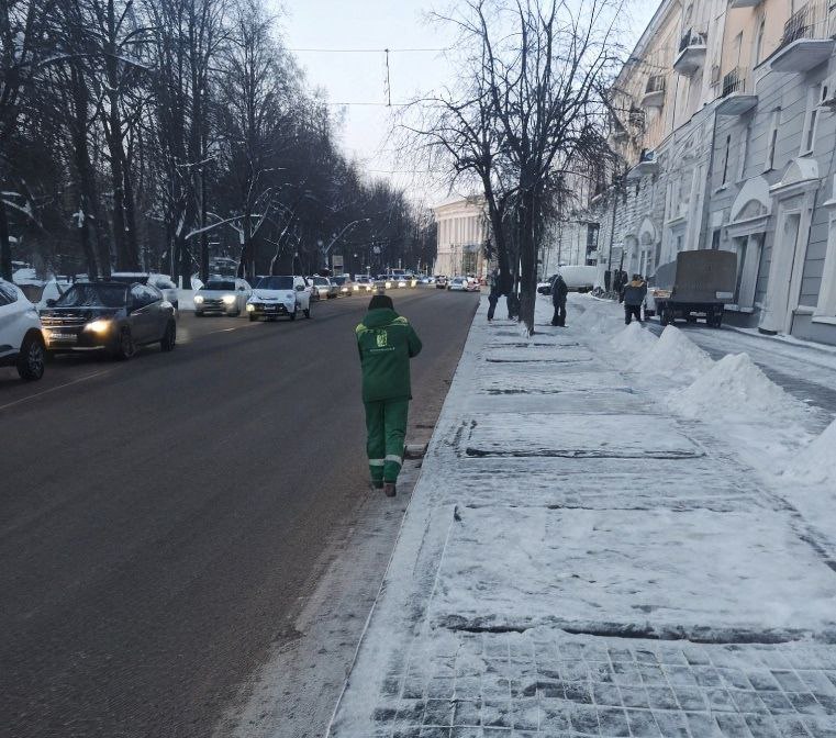 С раннего утра к работе подключились специалисты ручной уборки, которые очищают от наледи и снега пешеходные переходы, остановочные комплексы, а также тротуары, где нет возможности проводить механизированную уборку.
