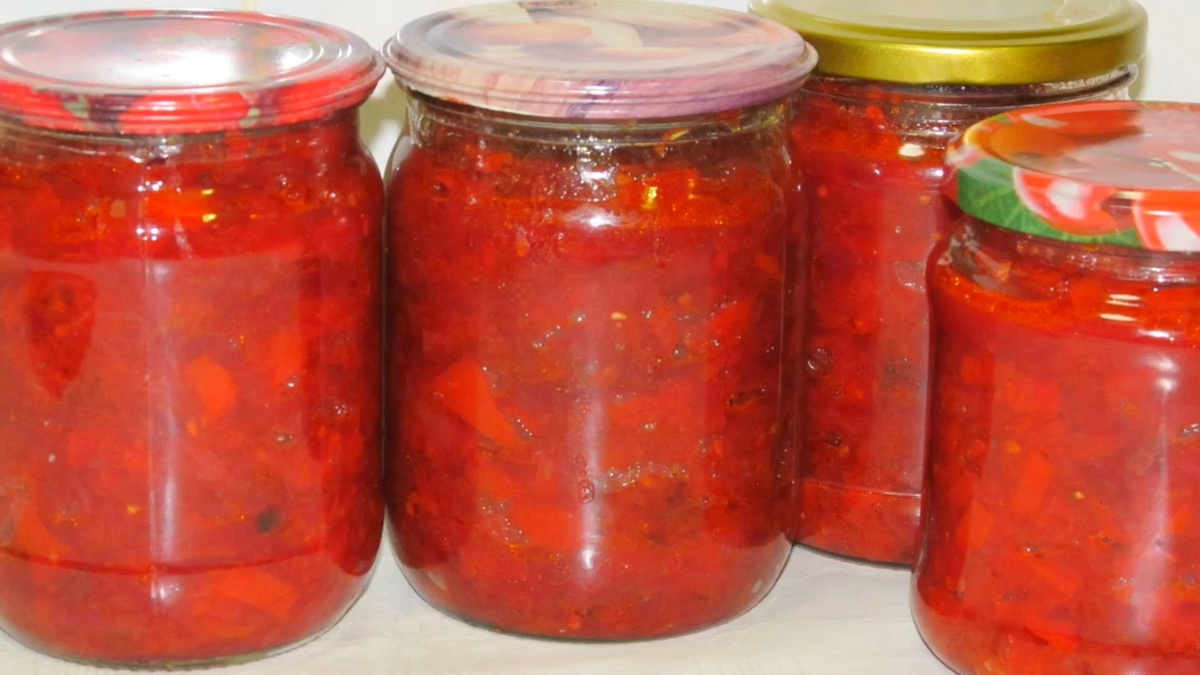 Всю смесь соединить, добавить помидоры и протомить в течение 30 минут, добавляя по необходимости воду. Когда заправка достигнет нужной консистенции, горячей разлить по стерилизованным банкам и закрыть крышками.