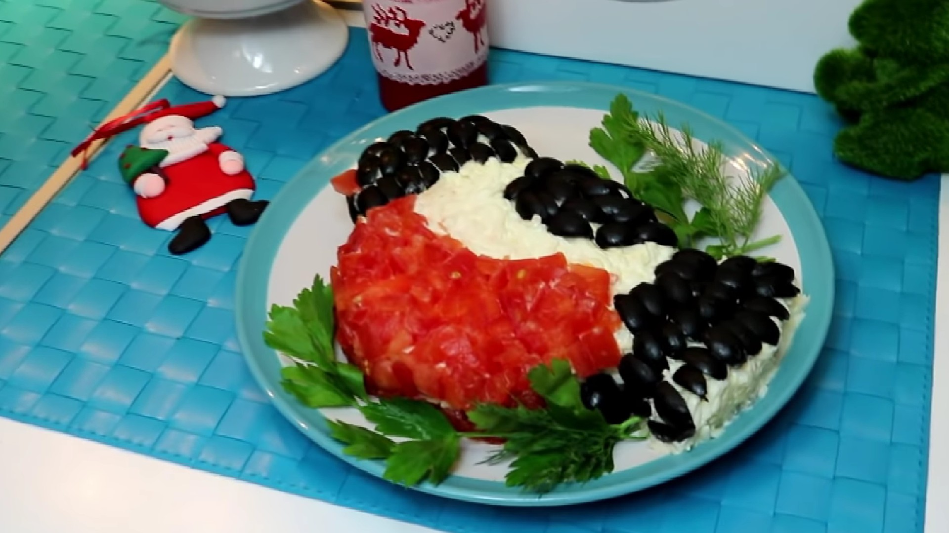 Также нанесите майонез на последний слой. Выложите из сыра спинку, а из помидоров грудку снегиря. Сформируйте из маслин крыло и голову птицы, советует Лайфхакер. Готово!