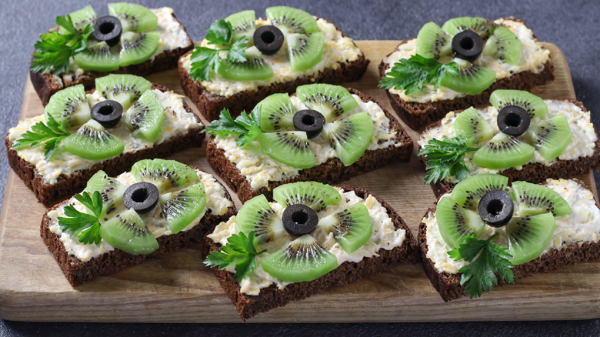 Маслины разрежьте пополам. Выложите на каждый ломтик хлеба половину маслины срезом вверх. Вокруг разместите киви. Украсьте листиками петрушки, рекомендует портал Лайфхакер, пишет Городовой.