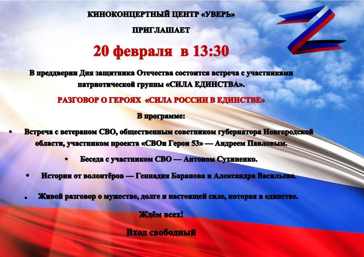 На мероприятии в киноконцертном центре «Уверь» будут присутствовать бойцы и ветераны СВО, участники проекта «СВОи Герои 53», волонтёры.