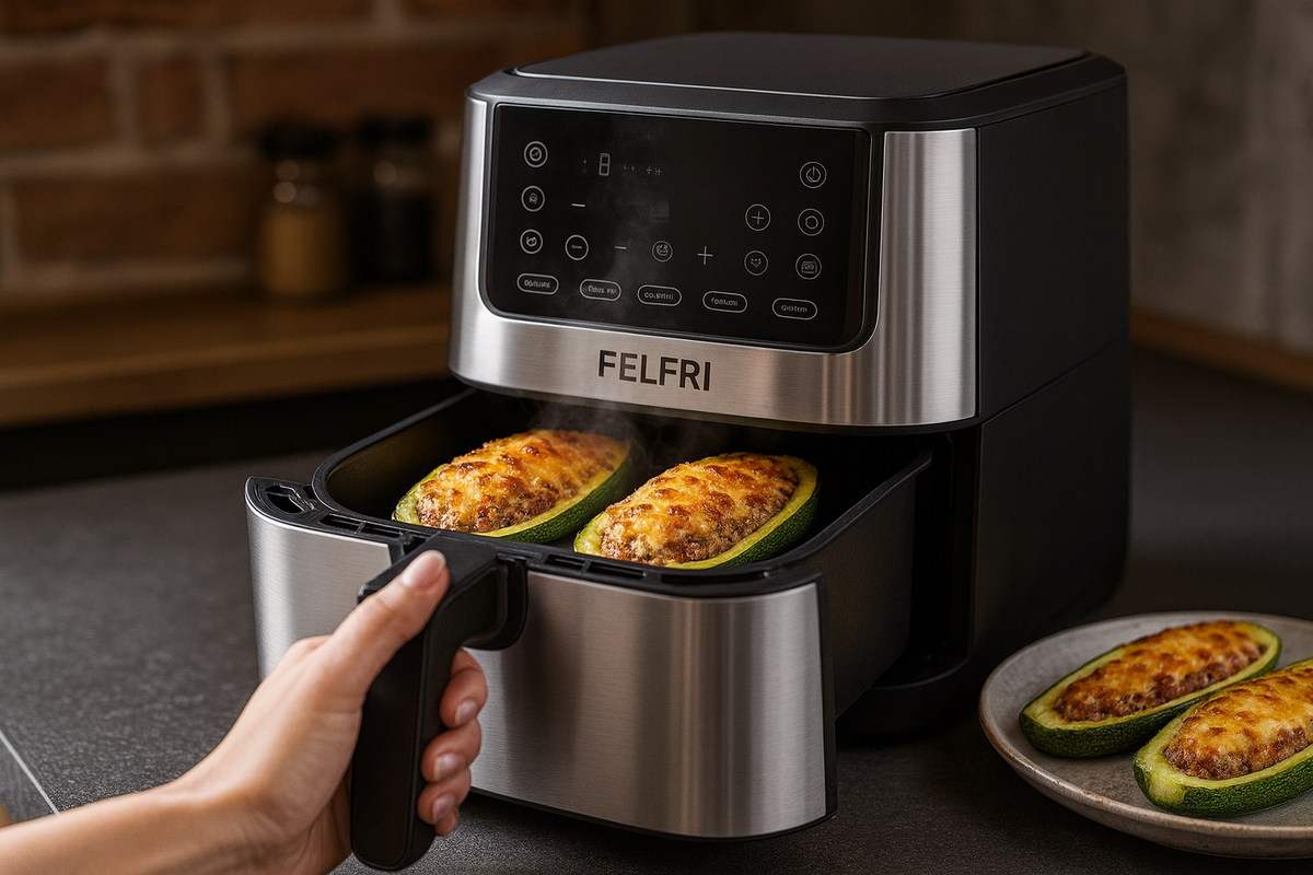 Для основного рецепта потребуется всего лишь несколько ингредиентов: кабачки, фарш и ваши любимые специи. Просто разрежьте кабачки вдоль, выдолбите мякоть и наполните их сочной начинкой. После этого поместите их в аэрогриль, предварительно настроив прибор на нужную температуру. Не забудьте указать время — около 20 минут будет достаточно для достижения идеального состояния.