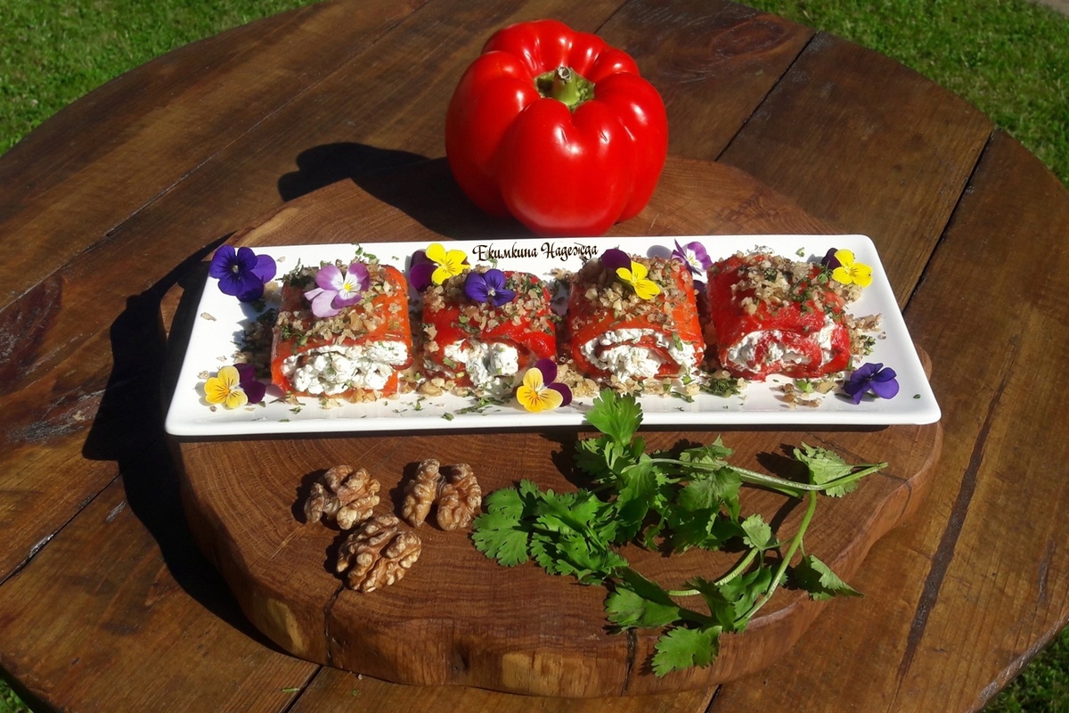 После этого перцы аккуратно заворачивают в рулетики. Для придания завершенного облика, блюдо сбрызгивают оливковым маслом, посыпают орехами и зеленью кинзы. Для эффектной подачи можно также украсить рулетики съедобными цветами, пишет канал "Рецепты от 7dach".