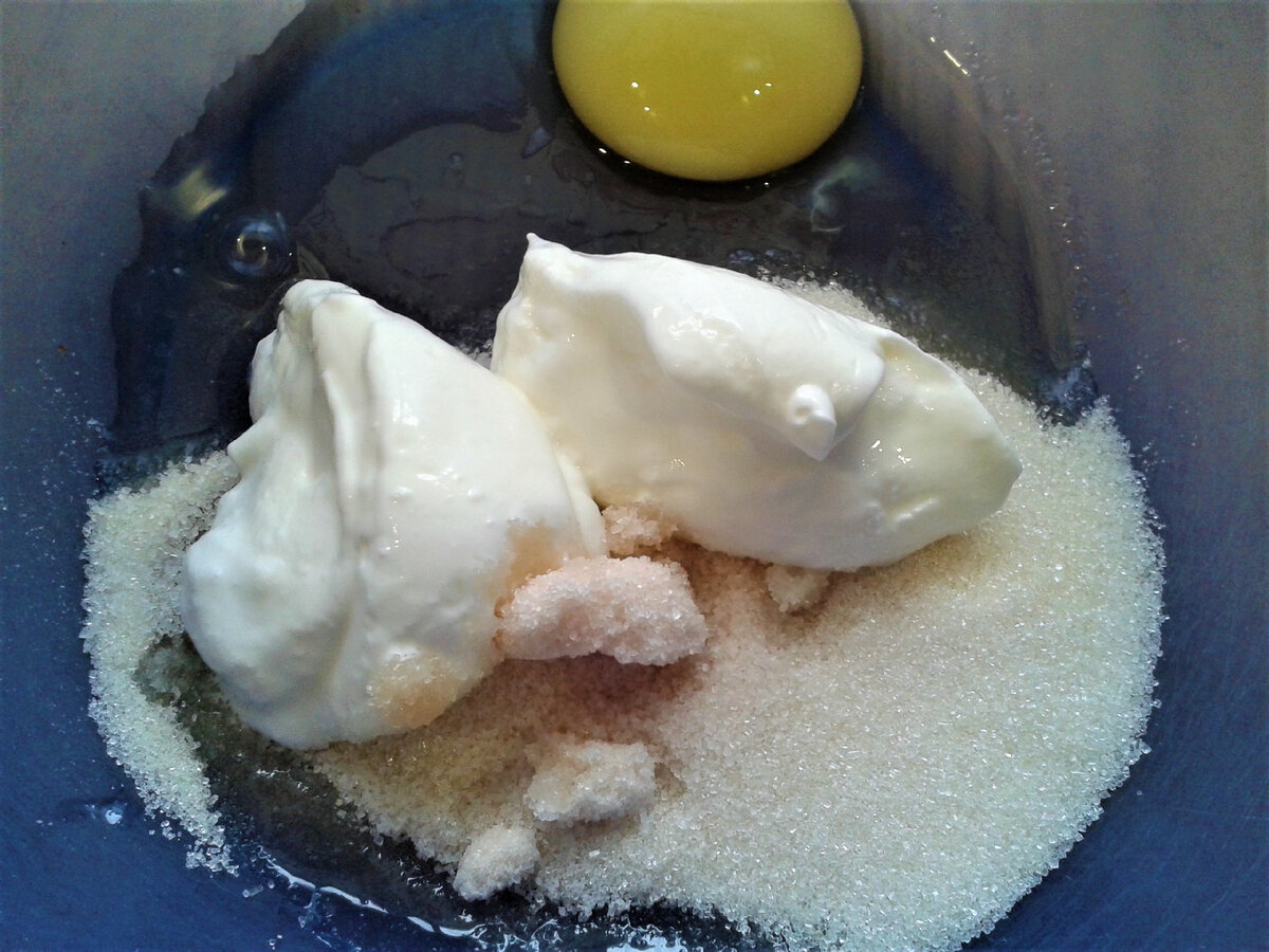 Для начала требуется замесить тесто. В глубокой миске разбивают яйцо и добавляют к нему щепотку соли, сахар, ванильный сахар и немного сметаны. Все компоненты тщательно перемешиваются, после чего вводят размягченное сливочное масло и просеянную муку с разрыхлителем.