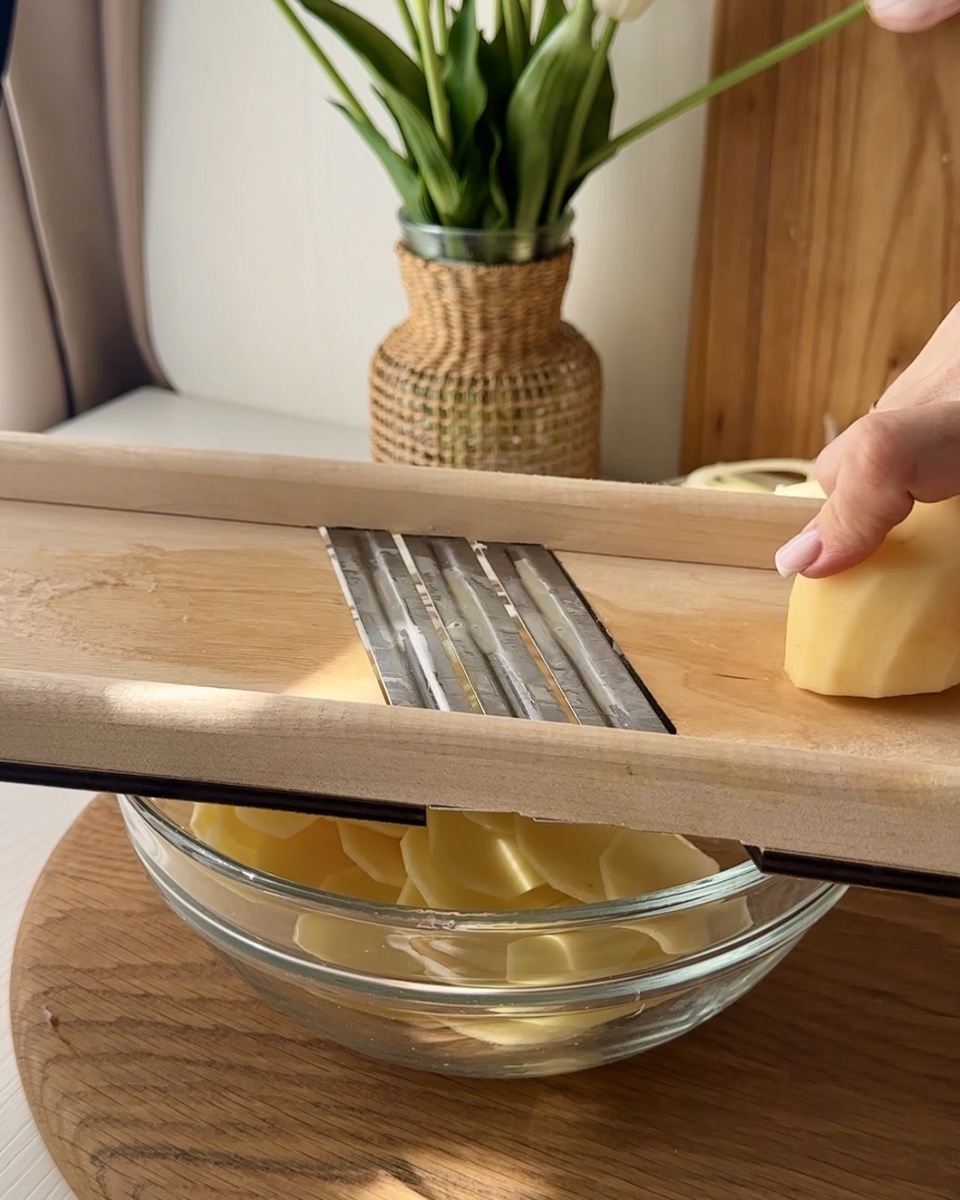 Начинаю с картошки: нарезаю ее тонкими слайсами при помощи терки. Это позволяет сократить время и получить ровные кусочки.