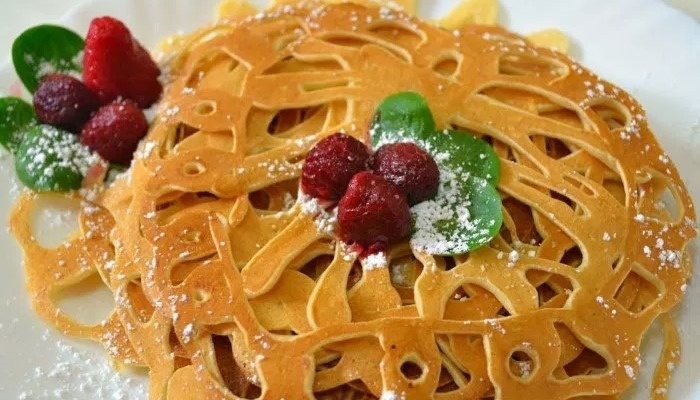 Если вы хотите порадовать своих близких ажурными блинчиками, можно использовать соусник или даже пластиковую бутылку с проколотой крышкой — это добавит оригинальности.