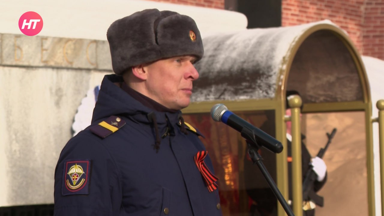 Вспоминали красноармейцев, защитников и освободителей Родины. О своих боевых товарищах, погибших на СВО, вспоминал у Вечного огня участник проекта «СВОи Герои 53» Дмитрий Кузьмичев.