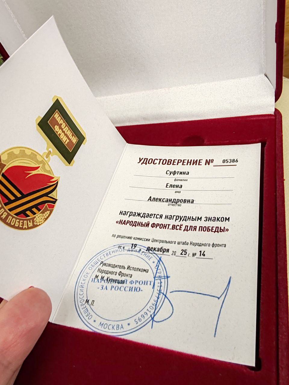 Знак ей вручили за благотворительный телемарафон «Всё для Победы!», в котором говорили с членами Народного фронта, фонда «Защитники Отечества», сообщества «Наша Земля. Помощь бойцам СВО», волонтёрами сообщества «Золотые руки ангела» и ветеранами СВО, участниками программы «СВОи Герои 53».