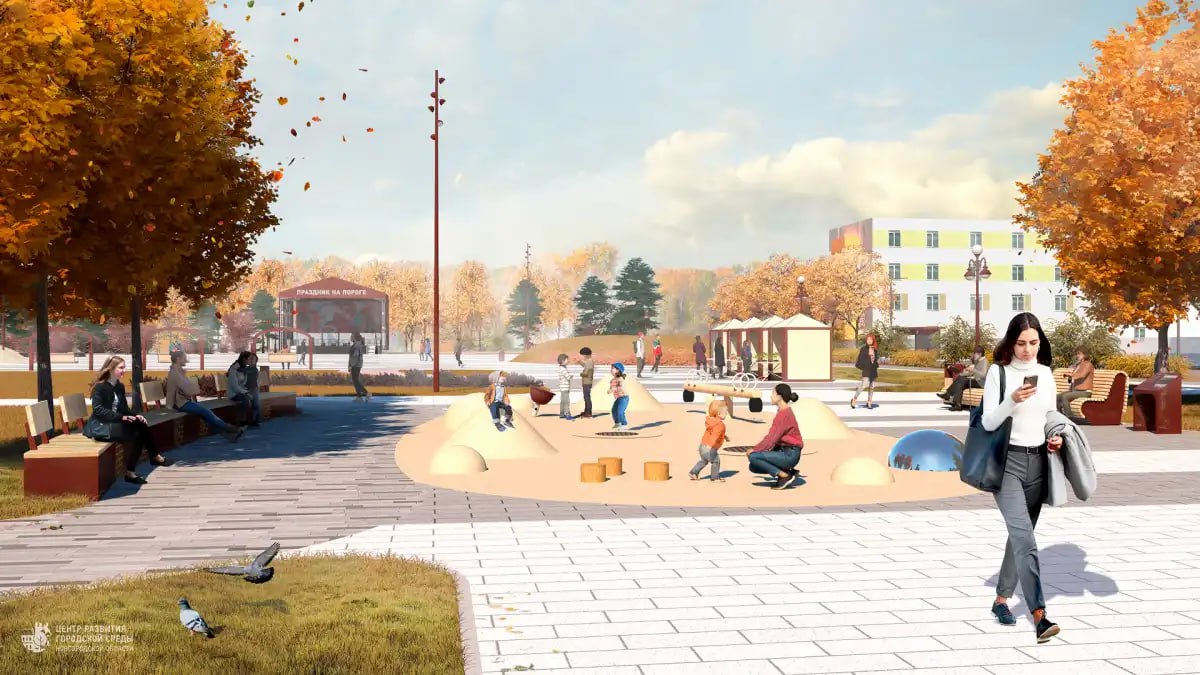 Пространство вокруг и перед Центром культурного развития, где в 2024 году запустили фонтанный комплекс с подсветкой, замостят в общей для площади стилистике, создадут пешеходные зоны, освещение, место для проведения уличных выставок, установят велопарковки.