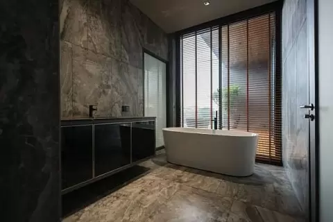 Не стоит забывать и о микроцементе, который становится фаворитом в отделке ванных комнат. Этот материал из мелкодисперсного цемента и полимеров создает бесшовную поверхность, исключая возможность накопления влаги. Он на ощупь теплее керамики, что обеспечивает комфорт.