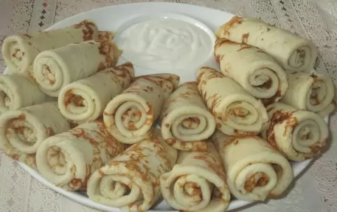 После того как тесто готово, ему необходимо отдохнуть около 10 минут. Тем временем, сковорода разогревается с добавлением растительного масла. Блины обжариваются до золотистой корочки с обеих сторон. Готовые блины выкладываются на тарелку в стопку, складываются пополам и сворачиваются в рулеты. Для подачи идеально подойдут сметана, варенье или даже мед.