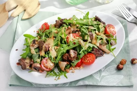 Черри разрезать пополам, а фундук - мелко порубить. Все ингредиенты: рукколу, печень, шампиньоны, помидоры и фундук смешать в одной емкости. Заправить соусом и подать к столу.