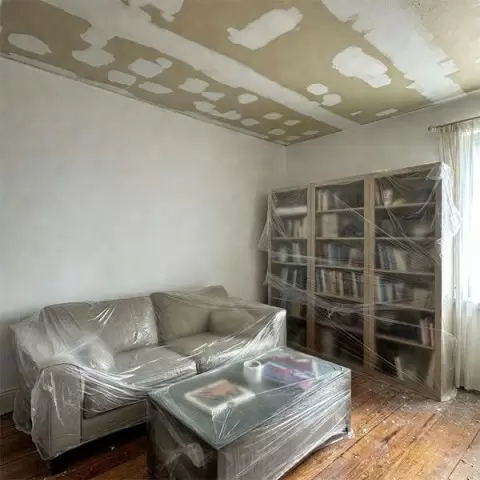 - Обернуть всю мебель плотной пленкой, особенно уделяя внимание мягкой мебели и открытым полкам;