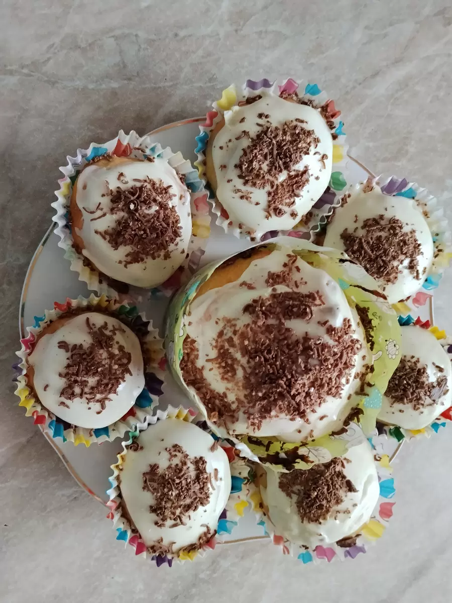 Итак, куличи получились пышными и ароматными! Готовые изделия можно украсить глазурью, состоящей из сухого молока и сгущённого молока, добавив немного яблочного уксуса для звучности вкуса. Учитывая отсутствие украшений в магазине, идеальным вариантом станет тёртый шоколад.